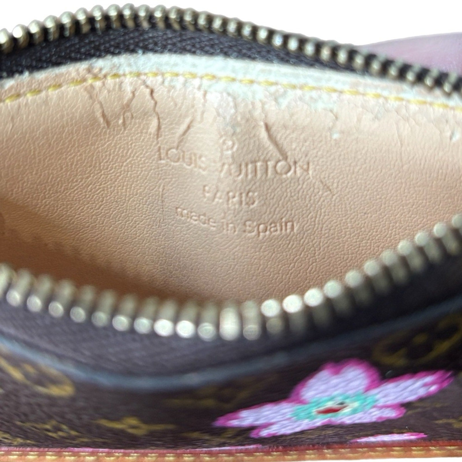 This is a genuine LOUIS VUITTON Murakami Monogram Cherry Blossom Key Holder in Brown. Crafted from monogram canvas with a playful overlay of pink smiling faces.