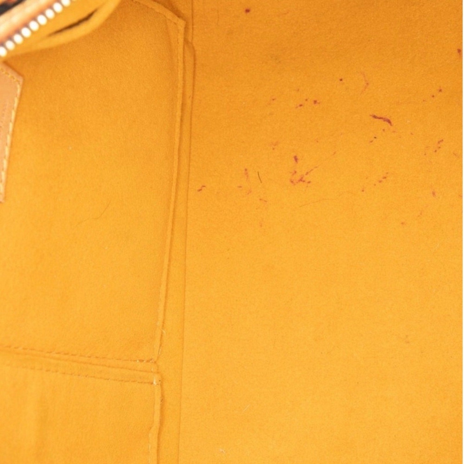 The exterior denim is clean and beautiful. The leather has developed a nice light honey patina overall and shows a some watermarks on some areas of the vachetta. The goldtone hardware is bright and crisp with only hairline surface scratches. The interior in great condition except for a few ink marks on the bottom.