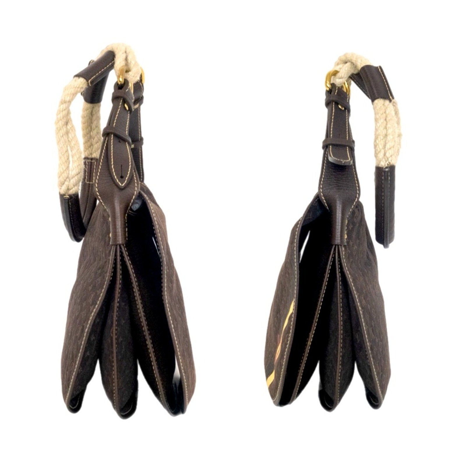 It features a crossbody strap made of leather and natural fiber rope, accented with gold-tone links. The design is complemented by a leather-trimmed full-flap closure with a refined monogram detail. The flap opens to reveal a spacious black fabric interior, perfect for carrying your daily essentials with timeless luxury and elegance.