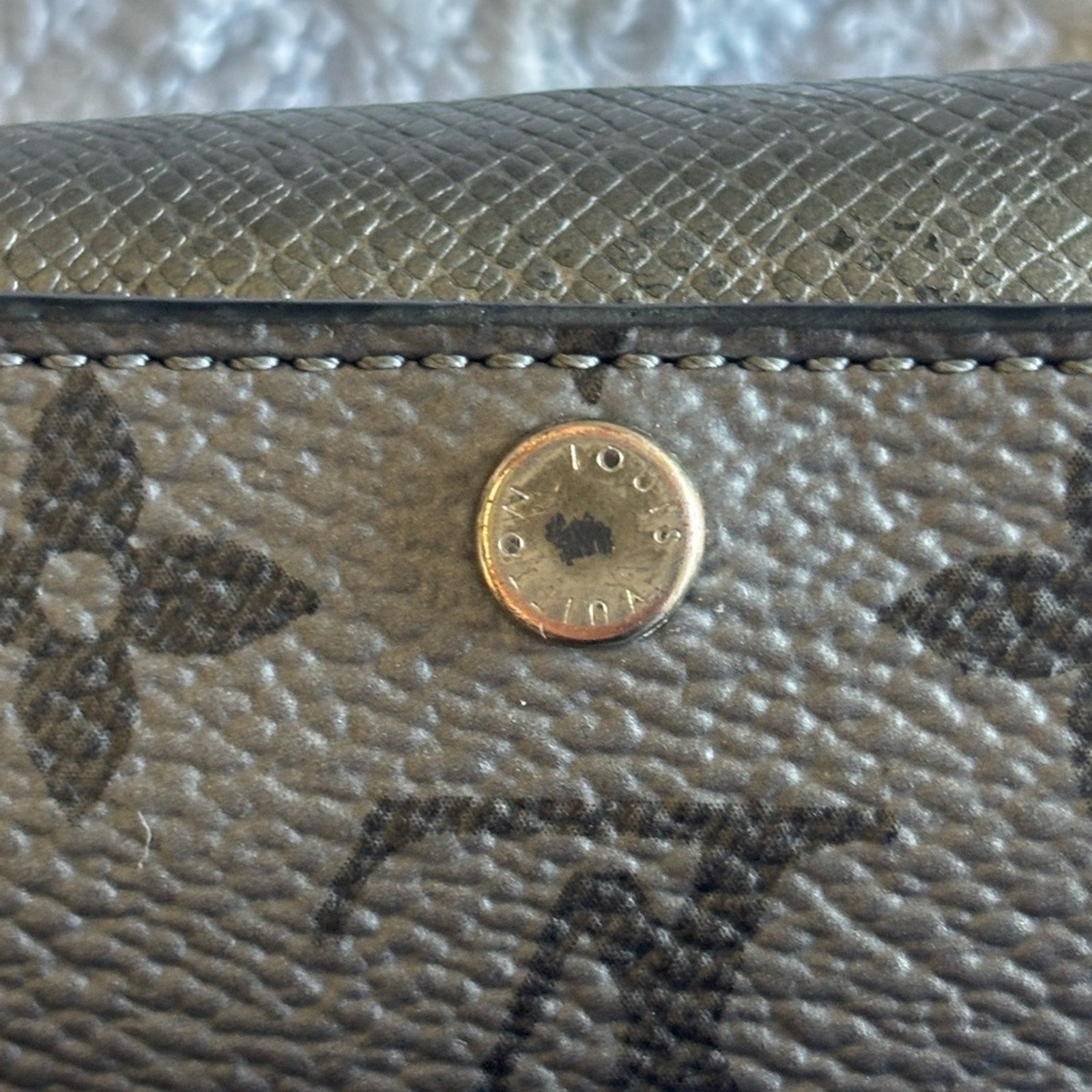 The Louis Vuitton Taigarama Monogram AirPods Case (M77285) In Monogram canvas and Taiga leather presents a sleek, modern look. Featuring a snap closure and a silver-tone clasp for easy attachment, it’s a compact and stylish way to protect and carry your AirPods with luxury.