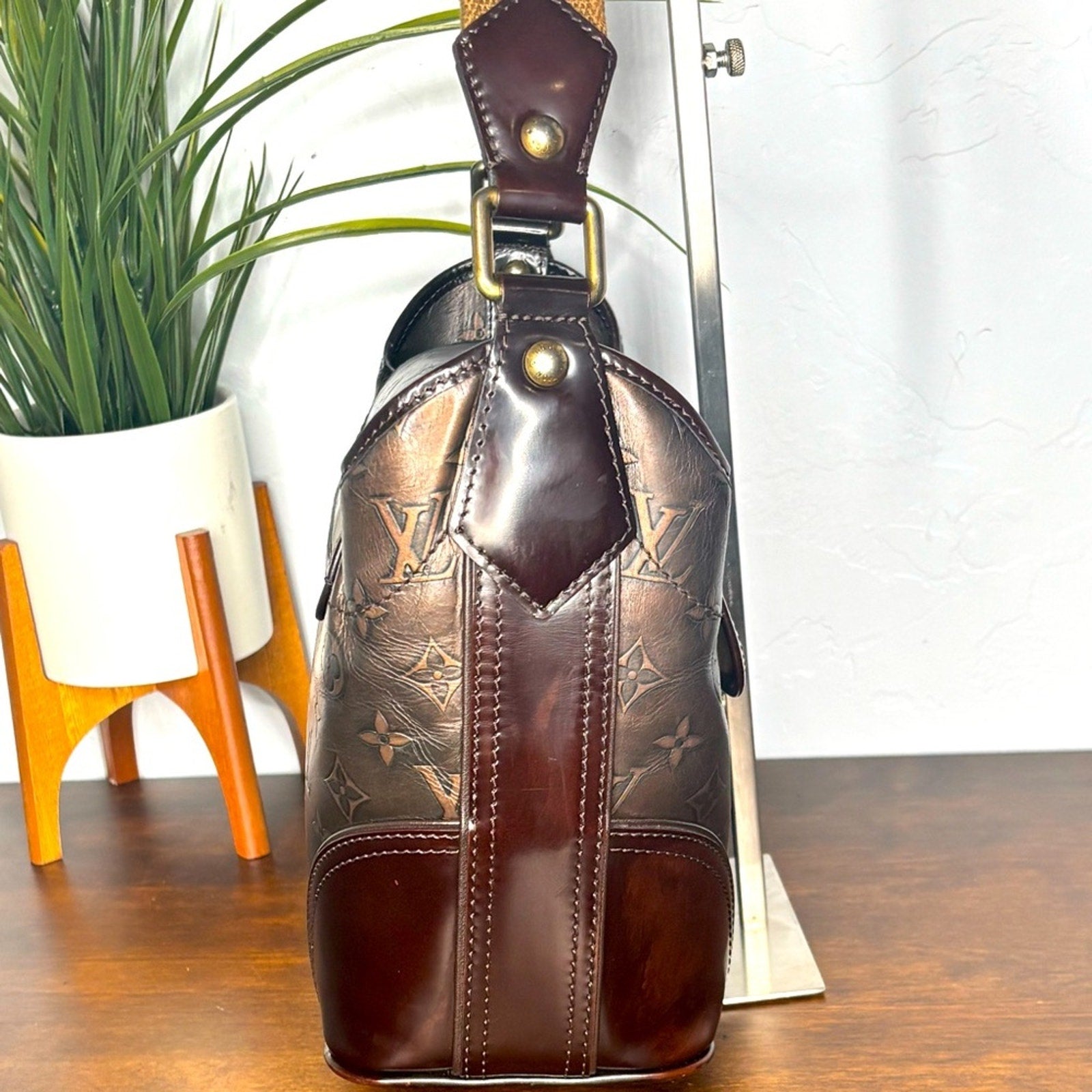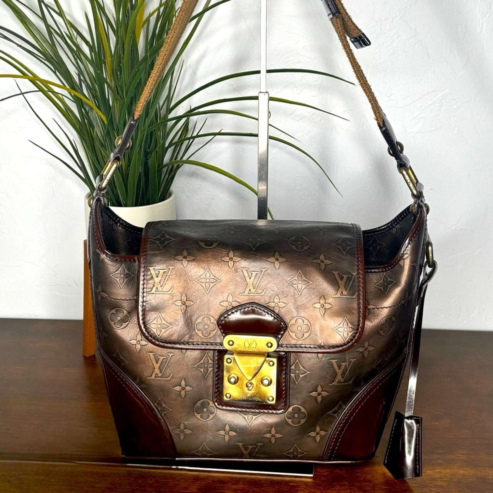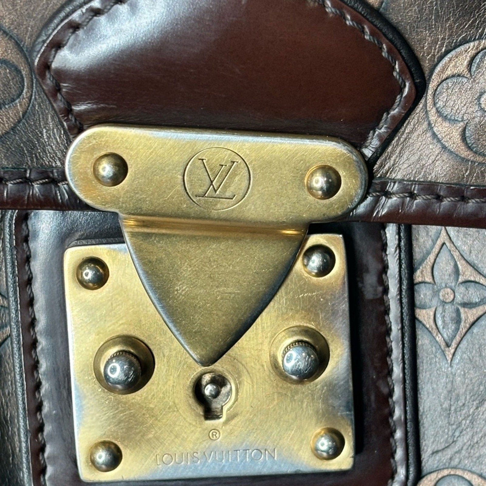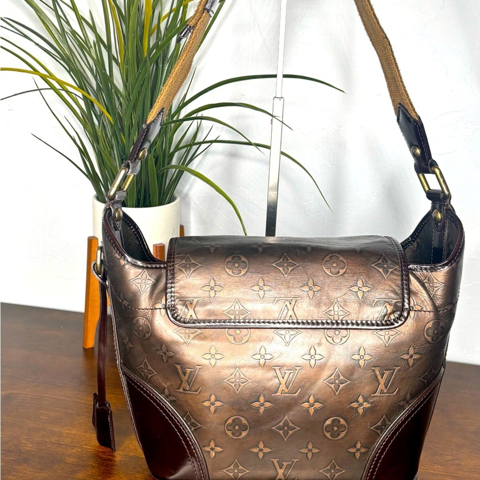From the Prefall 2007 collection comes this sophisticated Sergent shoulder bag. It showcases Monogram motif on antiqued metallic debossed bronzed leather with deep chocolate leather trim on a military like design.