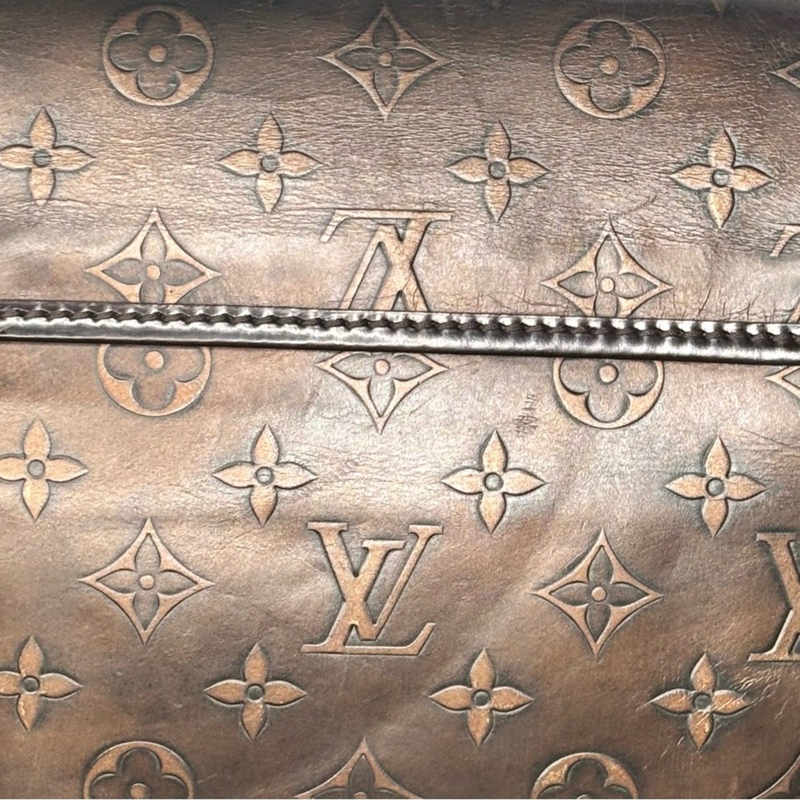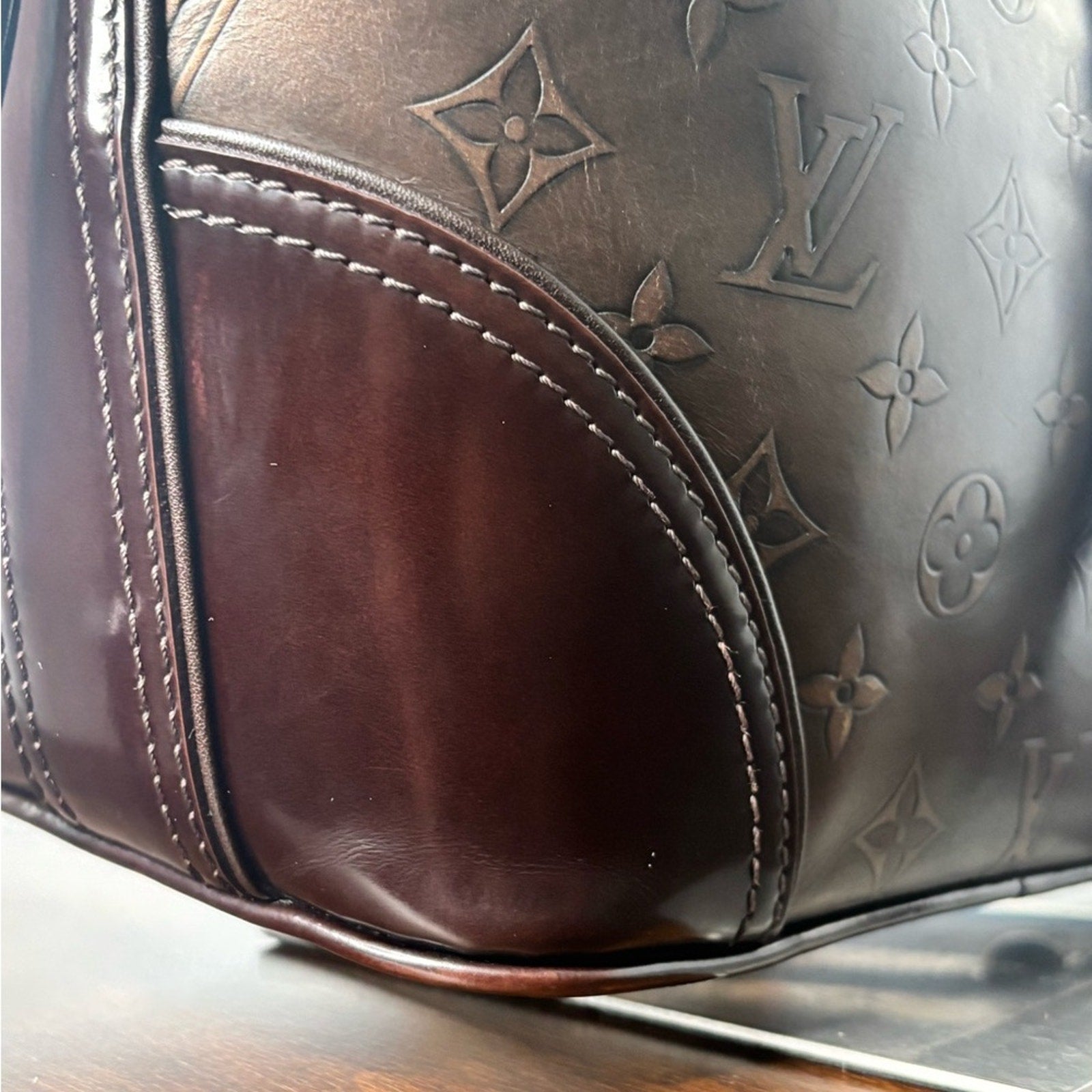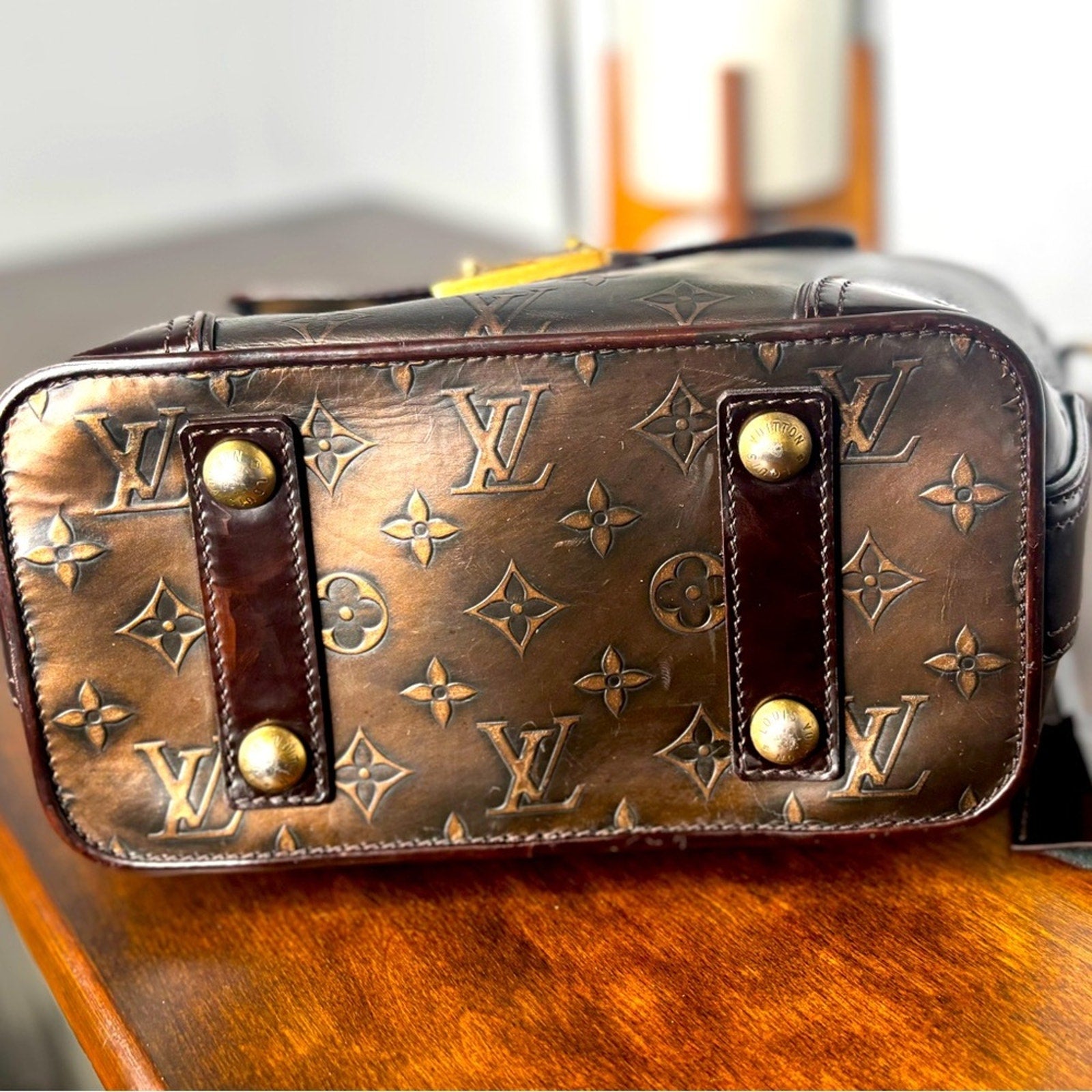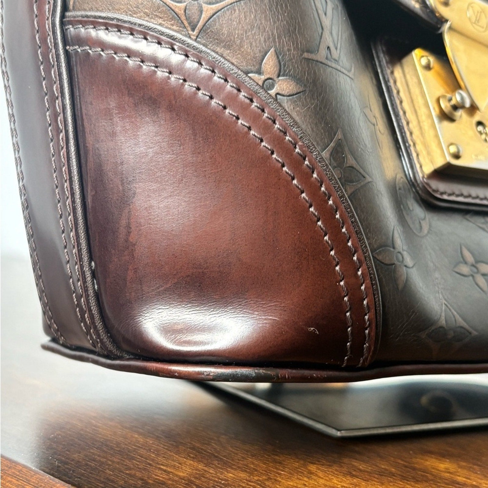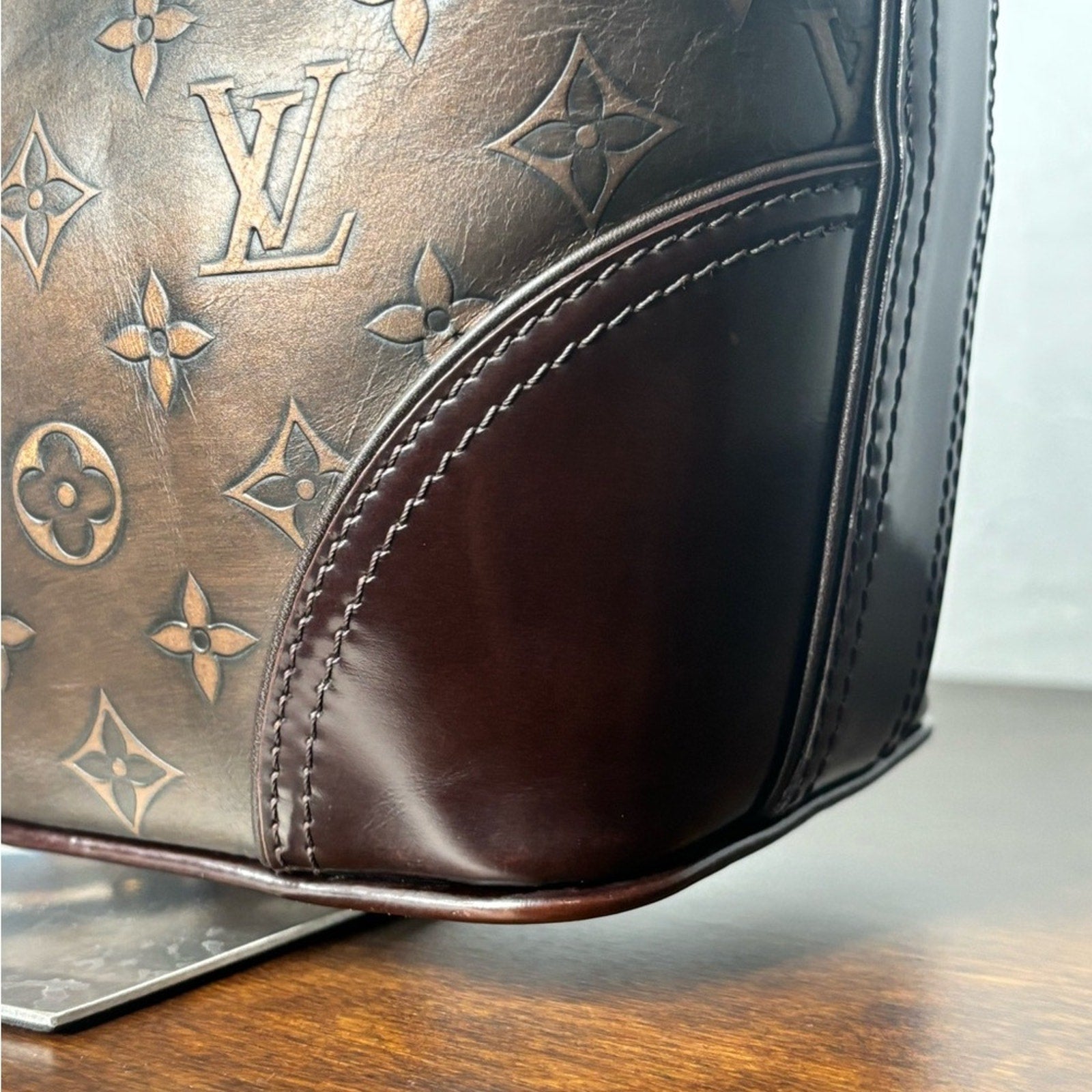 From the Prefall 2007 collection comes this sophisticated Sergent shoulder bag. It showcases Monogram motif on antiqued metallic debossed bronzed leather with deep chocolate leather trim on a military like design.