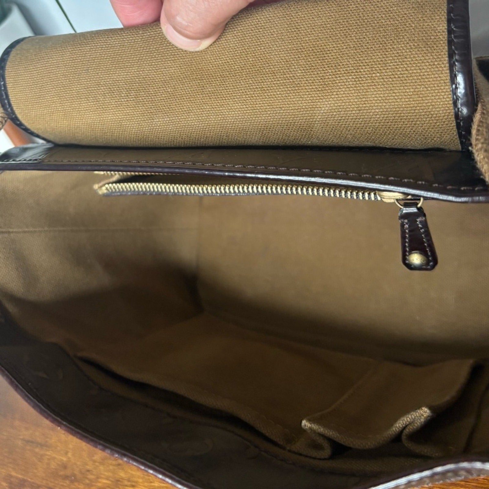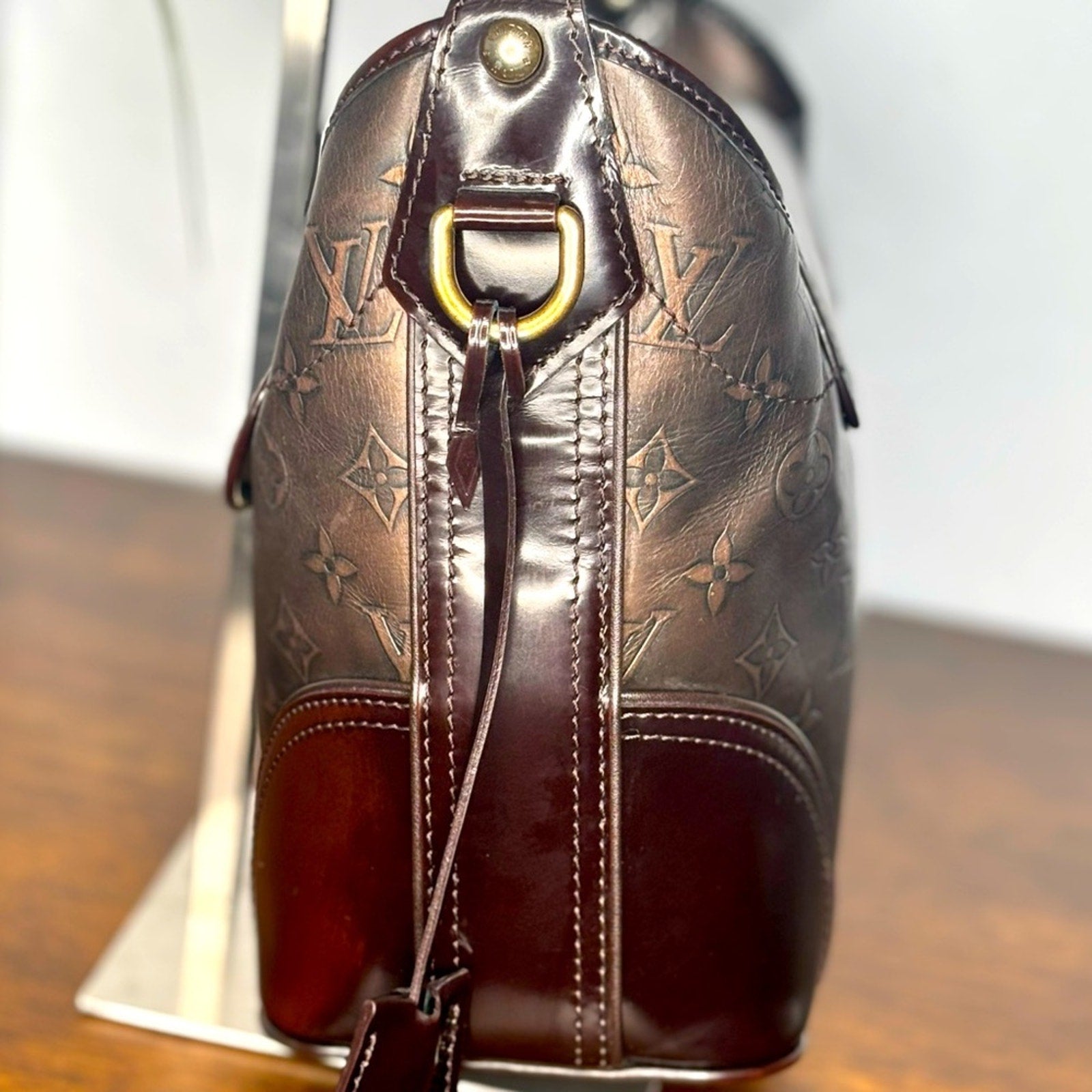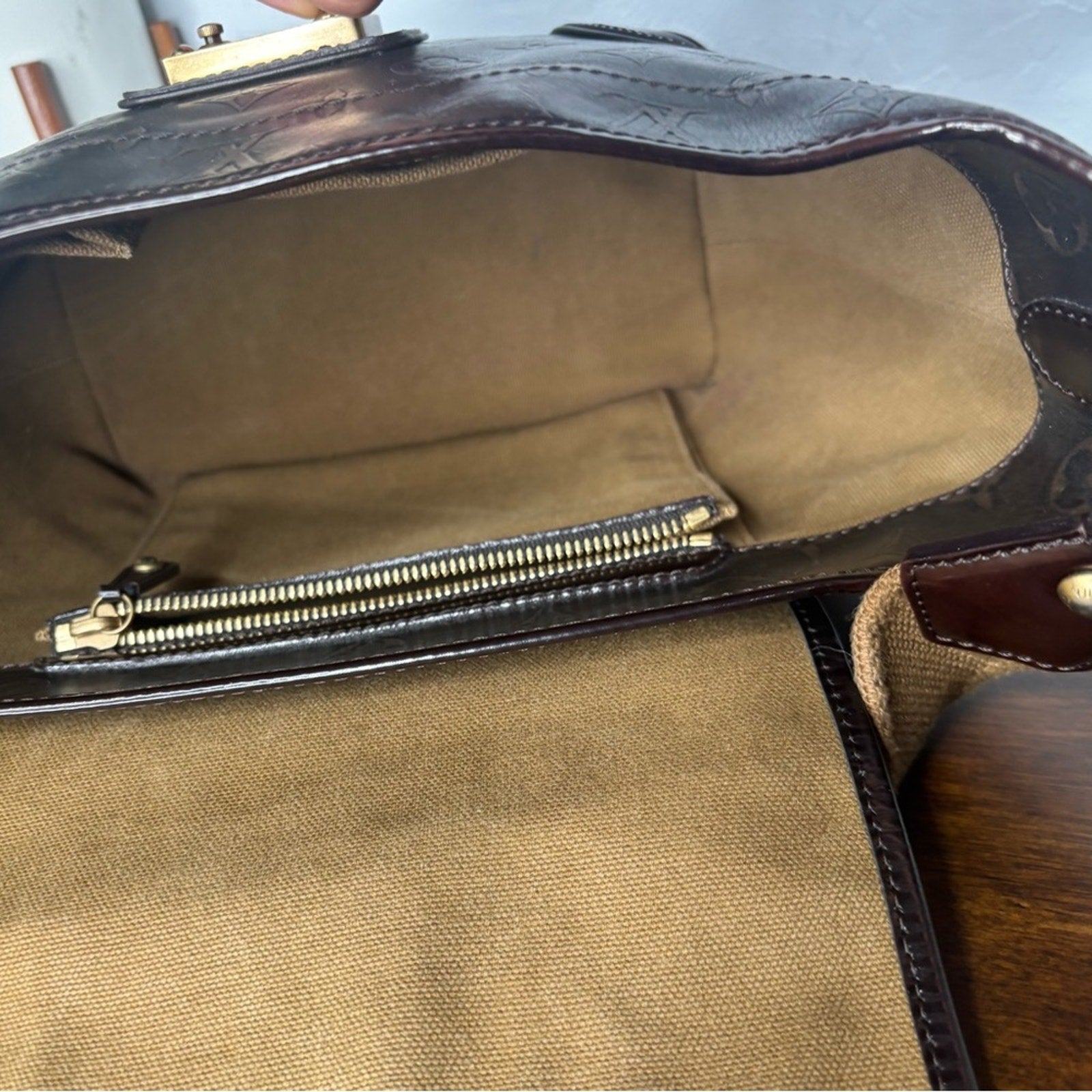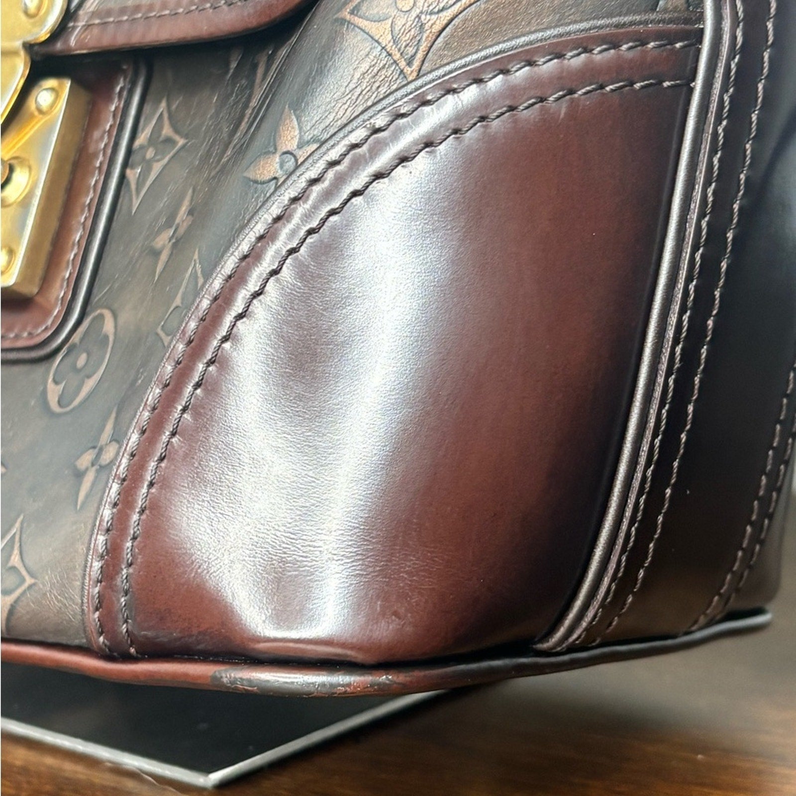 From the Prefall 2007 collection comes this sophisticated Sergent shoulder bag. It showcases Monogram motif on antiqued metallic debossed bronzed leather with deep chocolate leather trim on a military like design.