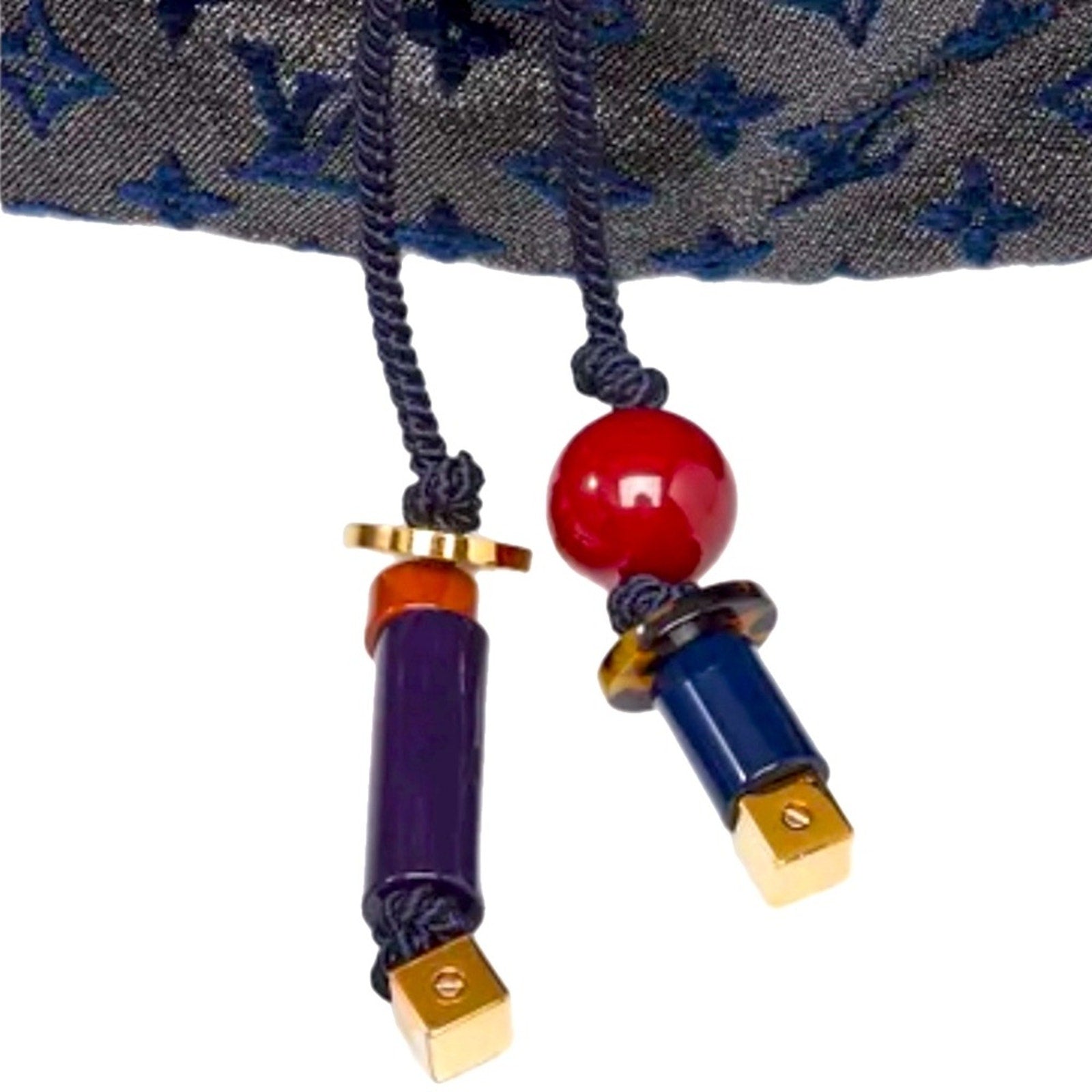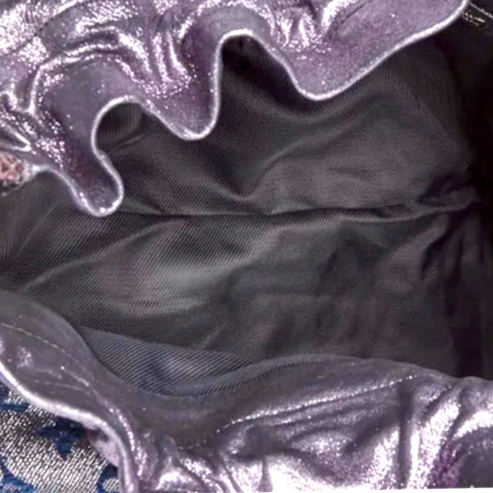The exterior is clean and beautiful with very faint signs of gentle rubbing to the bottom corners. The fabric braided drawstring has some fraying. The gold tone hardware has light surface scratches, but remains bright and crisp. The interior is clean. Overall this bag remains in excellent condition.
